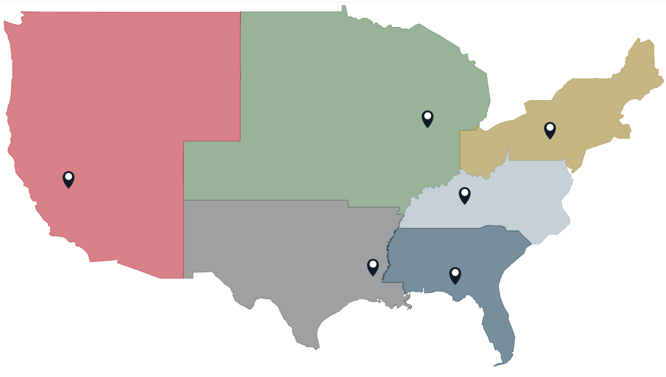 The interactive map below shows the six institutions we inspected within their respective BOP regions. Click on each pin for more details on an institution.